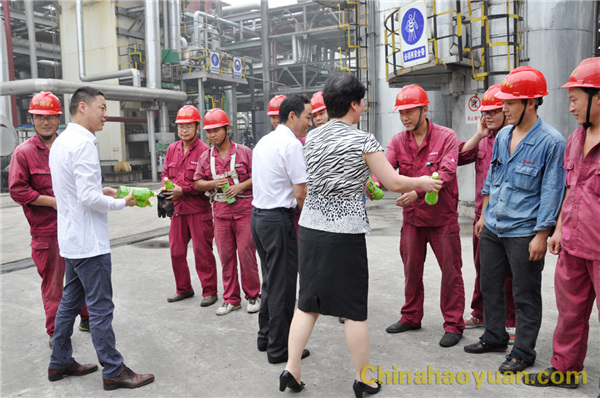 時下正值高溫酷暑,奮戰在生產一線的員工們頂烈日、戰高溫,為穩定生產及加快檢修進度,員工們揮灑汗水,正接受著高溫“烤”驗。8月6日上午,市政府副秘書長趙志賀,市總黨組書記、工會副主席房繼紅,在市安監局局長李哲、市化工協會會長李智的陪同下,蒞臨昊源集團,看望慰問高溫期間依然堅守在生產一線的昊源員工,關切地詢問生產和員工生活情況,并為員工送上防暑降溫物品。