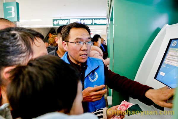 “骨科科診室在一樓西頭”、“預約取號在自助機上就可以辦”、“方便門診在一樓大廳玻璃門東側內”、“ 建卡、掛號、繳費、劃價、打印報告單都可以在自助機上完成”。來自昊源志愿者協會的志愿者們,耐心而又禮貌地對絡繹不絕前來詢問的患者說道。
