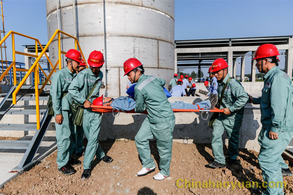 演練假想昊源公司園區正在建設的年產6000噸二甘醇胺項目配套罐區,某防腐公司4名員工對在建二甘醇胺儲罐內部進行防腐受限空間作業,因天氣炎熱,通風不良,2名工人在罐內工作時先后暈倒,外面監護的1名工人呼叫沒有反應,隨即進入罐內施救,罐外還留一名工人監護。進入罐內救援的工人告訴外面監護人員,罐內悶熱,呼吸困難,正準備將2名工人移出罐外,但是在移動罐內人員時感覺乏力,無法移動,施救人員也暈倒在罐內。罐外監護的工人趕緊尋求幫助,正好遇見路過此處巡檢的操作人員,操作人員迅速了解情況,緊急將情況匯報公司領導。公司領導立即組織人員自救,聯系120急救中心人員救援,并逐級向市應急局、市政府匯報事故情況。