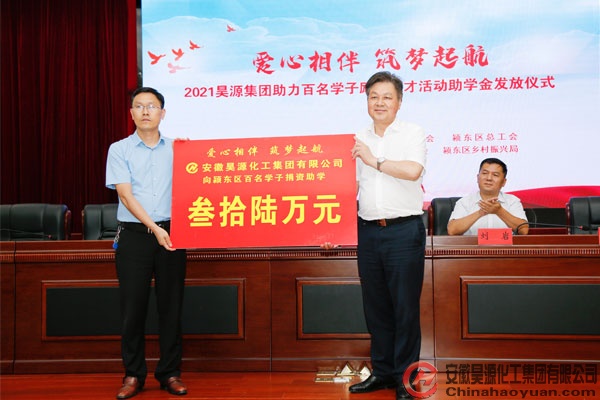 隨后,安徽昊源化工集團有限公司向潁東區(qū)政府捐贈36萬元,用于設(shè)立勵志助學(xué)金,幫助勵志學(xué)子順利走進大學(xué)、繼續(xù)深造,用知識改變自己的命運。