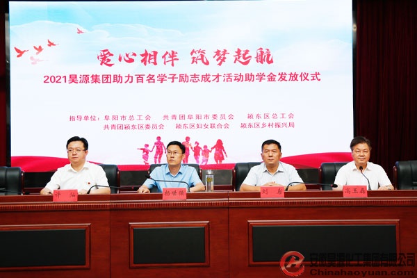 8月27日,“2021年昊源集團助力百名學(xué)子勵志成才活動”愛心助學(xué)獎學(xué)金發(fā)放儀式在潁東區(qū)政府會議室舉行。潁東區(qū)委副書記楊世強,阜陽市總工會副主席劉巖,共青團阜陽市委副書記許燦,安徽昊源化工集團有限公司黨委副書記、副總經(jīng)理高玉磊出席活動。