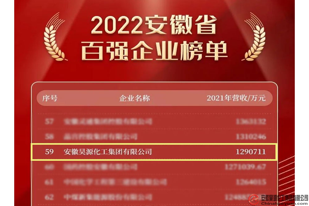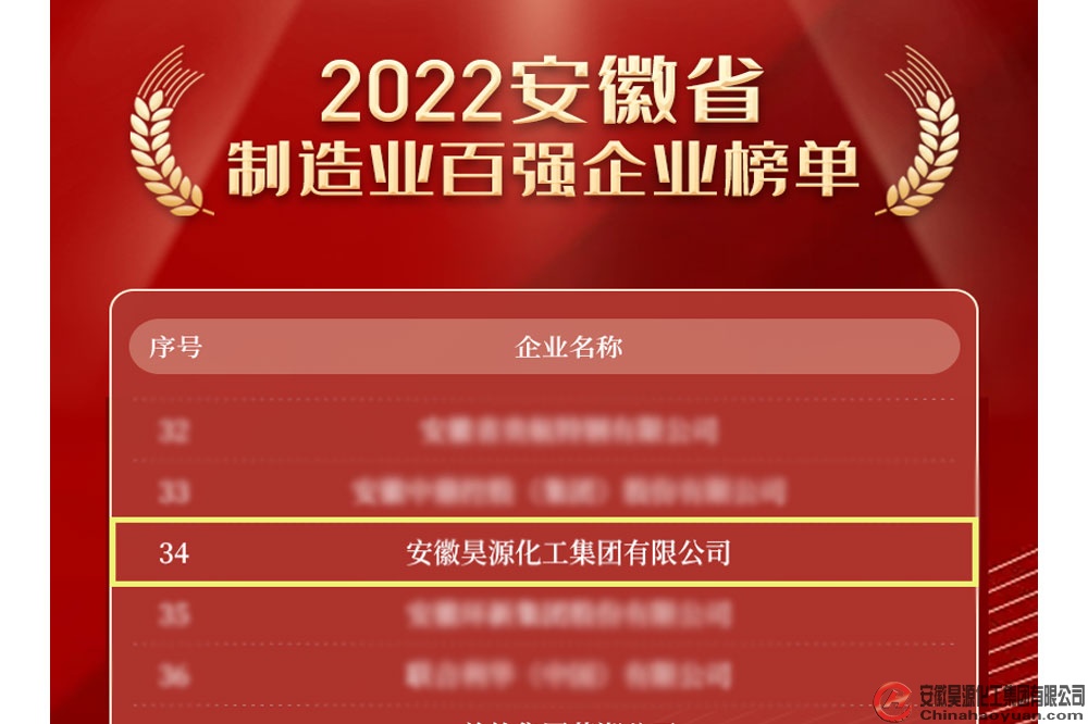 12月12日,安徽省企業聯合會、省企業家聯合會發布“2022安徽省百強企業”榜單,安徽昊源化工集團有限公司位列百強企業榜單第59位,制造業百強企業榜單第34位。