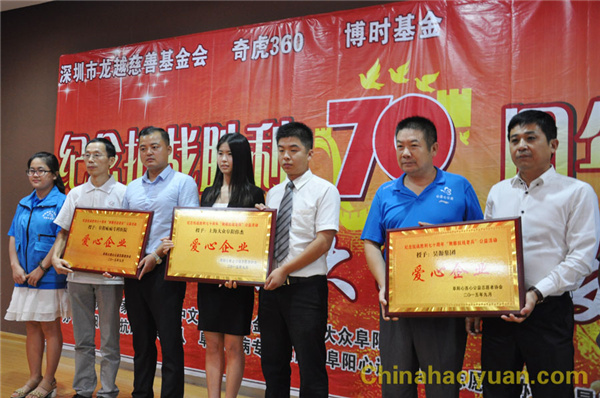 上午九時,在阜陽市疝病醫院的禮堂里,昊源集團榮獲“紀念抗戰勝利70周年致敬抗戰老兵”活動“愛心企業”稱號,昊源集團自七月份開始參與“關注歷史、關愛老兵”的活動以來,工會副主席戚偉組織昊源集團青年志愿者服務隊頂著高溫走訪二十多名抗戰老兵。為這些曾經為祖國、為民族浴血奮戰的民族英雄送去了集團公司的最崇高敬意。