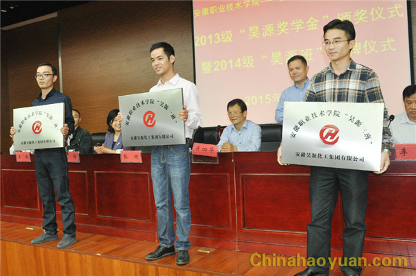10月23日,安徽職業技術學院2013級“昊源獎學金” 頒獎儀式暨2014級“昊源班” 授牌儀式在安徽職業技術學院圖書館三樓報告廳隆重舉行。公司副總經理楊捷、企管處處長張明、擴建辦副主任沈獻、安徽職業技術學院院長亓四華、副院長史鋒、化學工程系主任方向紅等出席頒獎授牌儀式。