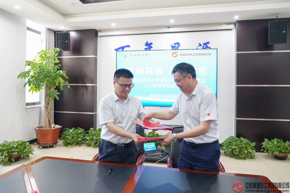 6月17日下午,昊源公司與阜陽職業(yè)技術(shù)學(xué)院校企合作簽約儀式在昊源園區(qū)會議室隆重舉行。阜陽職業(yè)技術(shù)學(xué)院黨委書記張沖,黨委副書記、院長郝文清,副院長王明躍,公司黨委書記、董事長凡殿才,總經(jīng)理助理潘家成出席簽字儀式。
