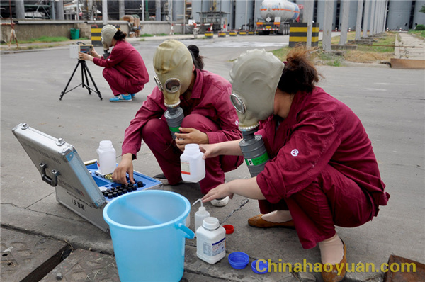 隨著演練開始口令下達,氨庫沖裝人員發現3#儲氨罐頂部漏氨,便立即向車間報告液氨泄露情況。隨后,車間快速向安全科及生產辦匯報,公司迅速啟動?;沸孤妒鹿蕦m棏鳖A案,并在聯合車間成立指揮部??傊笓]李超群在向聯合車間主任苗田生了解情況后,立即通知各救援隊緊急向指揮部集合。人員迅速集合到位,李超群當即下達救援命令。安全科人員緊急疏散下風口人群,保衛科在現場拉起隔離帶禁止無關人員進入,公司消防隊利用現場高壓水槍對泄露液氨進行吸收、壓制,防止氨氣進一步擴散。聯合車間主任苗田生收到總指揮下達的搶險任務后,立即安排兩名操作工及兩名維修工趕往球罐頂部,在水槍的噴射配合下,搶險隊員一鼓作氣沖向漏點迅速將泄漏點根部閥門關閉,泄露消除。環??迫藛T現場進行廢水及空氣檢測,并將檢測結束隨時報告指揮部。險情排除,環境檢測合格,隨即集合隊伍,總指揮李超群下達結束緊急狀態命令,并要求安全科調查本次泄露事故原因,做好警示教育,演練結束。