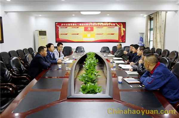 凡殿才向賈國華一行匯報了昊源公司近期生產經營情況,阜陽煤基新材料產業園區規劃、建設進度,昊源公司新產品開發、科技創新等。
