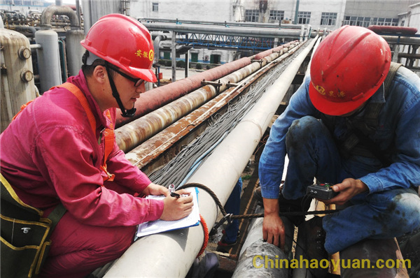對檢查發現的隱患詳細記錄,并反饋給所在車間及時整改,杜絕隱患的存在。另外,對照管線圖,對管壁厚度進行測量、記錄,全面掌握管道壁厚變化情況。