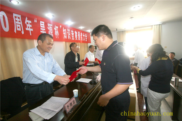 9月29日上午,慶祝建國60周年“昊源杯”知識競賽頒獎大會在阜陽市直工委會議室隆重舉行 。阜陽市委常委、市委秘書長亓龍,安徽昊源化工集團有限公司黨委副書記李繼忠等出席了本次頒獎大會。此次知識競賽是由市直工委、市委黨史研究室、市經委等單位聯合組織,昊源化工集團獨家冠名贊助舉辦。本次活動旨在慶祝建國60周年,進一步弘揚愛國主義精神,讓廣大干部群眾了解黨的光輝歷史。自7月4日活動開展以來,截至9月15日止,共收到答卷2881份,其中505份全部正確。經評審團評審,共評出一等獎5名、二等獎10名、三等獎20名、紀念獎30名和組織獎5個。圖為公司黨委副書記李繼忠向獲獎選手頒獎。(公司辦:朱梅)