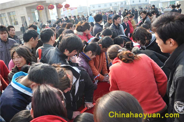 2月24日,位于阜陽市潁泉區循環經濟園內的安徽昊源天泉塑業公司門前人頭涌動。為了鼓勵外出務工人員返鄉就業,潁泉區勞動局與安徽昊源天泉塑業公司、阜陽循環經濟園、周棚辦事處聯手,在昊源天泉塑業公司舉行農民工現場招聘會,這是潁泉區首次在企業舉辦的農民工招聘洽談會。潁泉區人民政府副區長謝法衛、區勞動和社會保障局局長陳巍、安徽昊源天泉塑業公司總經理田懷廣、周棚街道辦事處主任許令軍等領導出席了招聘會。