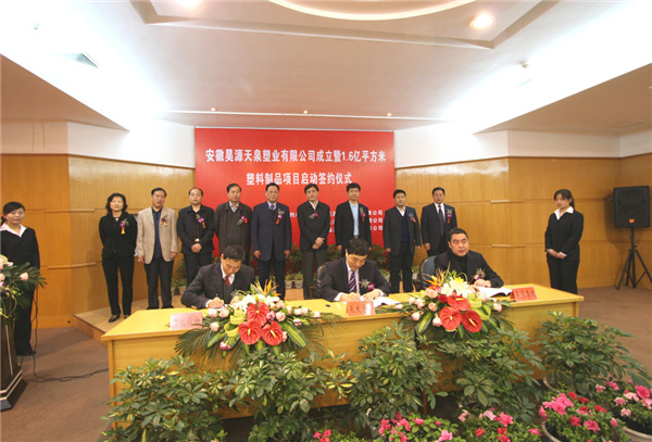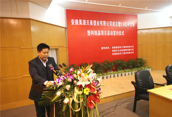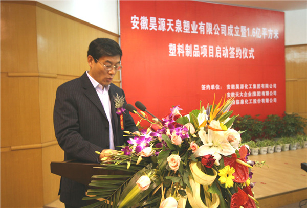 2008年4月22日上午9時18分,在阜陽市政府三樓一號會議室,隆重舉行安徽天大企業(集團)有限公司、安徽臨泉化工股份有限公司、安徽昊源化工集團有限公司合作成立安徽昊源天泉塑業有限公司簽約儀式暨建設1.6億平方米塑料制品生產線啟動儀式。