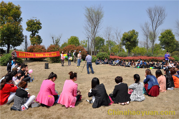 不知不覺經(jīng)過兩個小時的行駛,我們終于到達了本次活動的目的地:潁上濕地公園。望著對面一群群時尚靚麗的女孩,我們公司男生頓時興致高昂,此時,在團委書記馮婷婷的帶頭組織下,大家選取公園一角,圍坐成一圈,在相互介紹姓名和愛好后,開始了愉快的游戲時光,“昊京香”三家公司男女生互相搭配,默契的完成了一系列游戲動作。