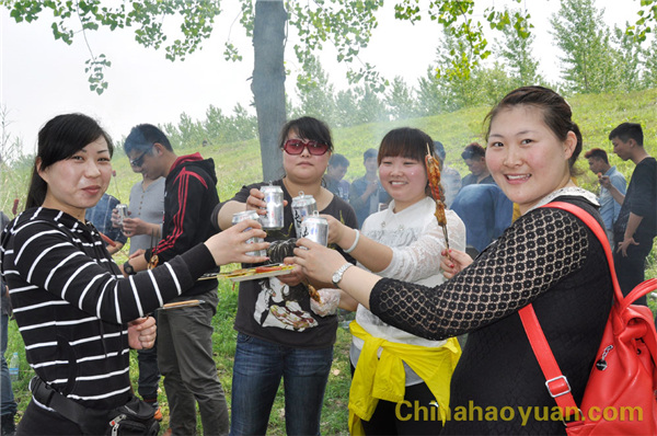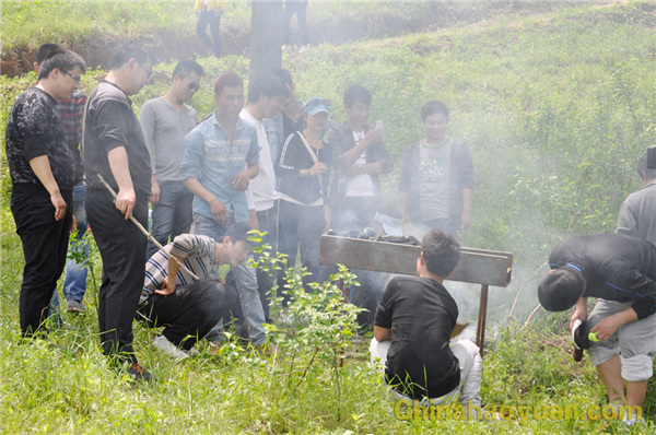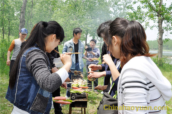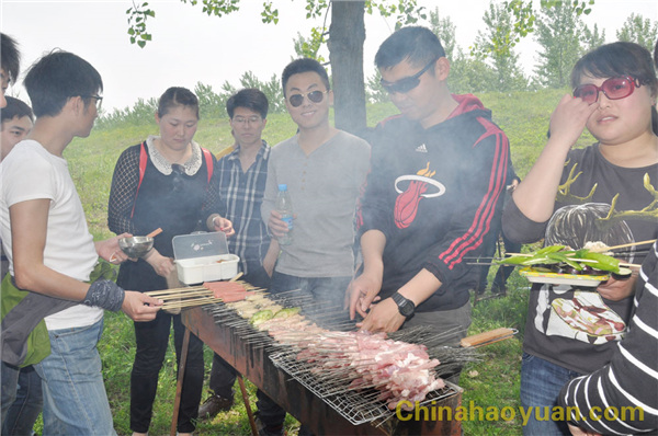 稍作休息,大家便開始了此次燒烤活動的準備工作,拾柴火、生爐子、串肉串,一片熱火朝天的忙碌景象。