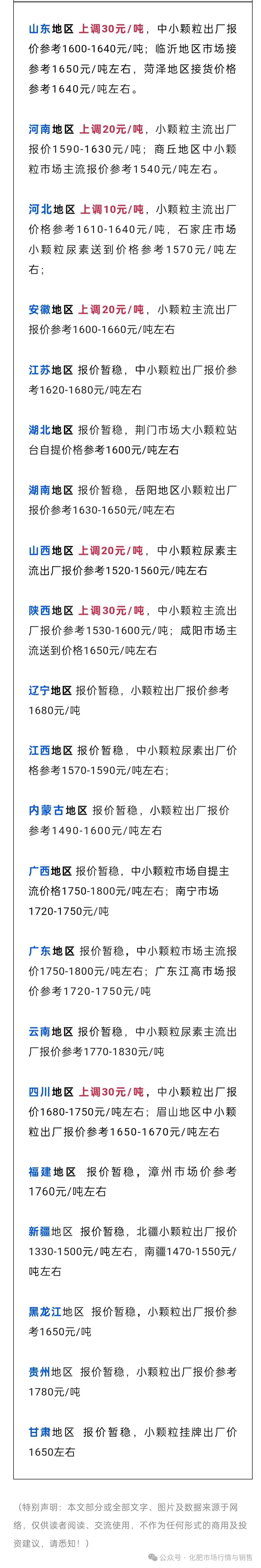 受需求增多、印標價格上漲及尿素期貨行情連續(xù)大幅上漲影響,國內(nèi)尿素現(xiàn)貨價格大范圍上漲,調(diào)整幅度10-30元/噸。目前尿素日產(chǎn)量維持在20萬噸左右,供應(yīng)壓力仍存。需求端以復合肥與板材行業(yè)剛需為主,整體改善有限,市場觀望情緒較濃。隨著尿素期貨行情上漲,預計短時間內(nèi)尿素價格或?qū)⒄鹗幾邚姟?/span>