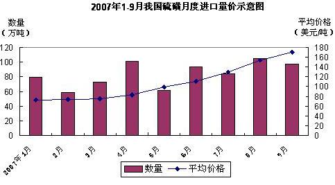 中國海關統計數據顯示, 2007 年前 3 季度,我國共進口硫磺 753.6 萬噸,價值 8.4 億美元,比 2006 年同期分別增長 16% 和 56.4% 。