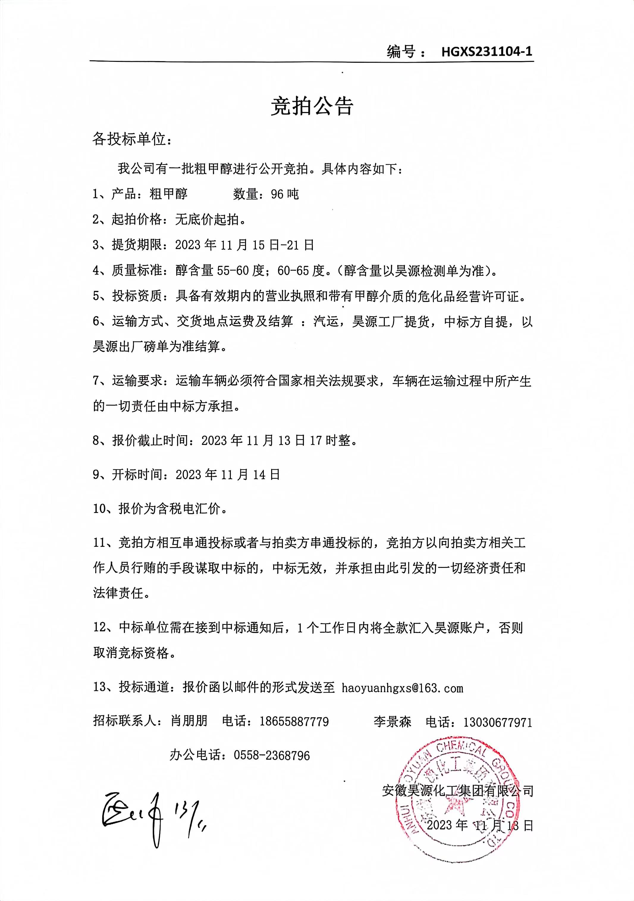 化工銷售公司粗甲醇競拍公告