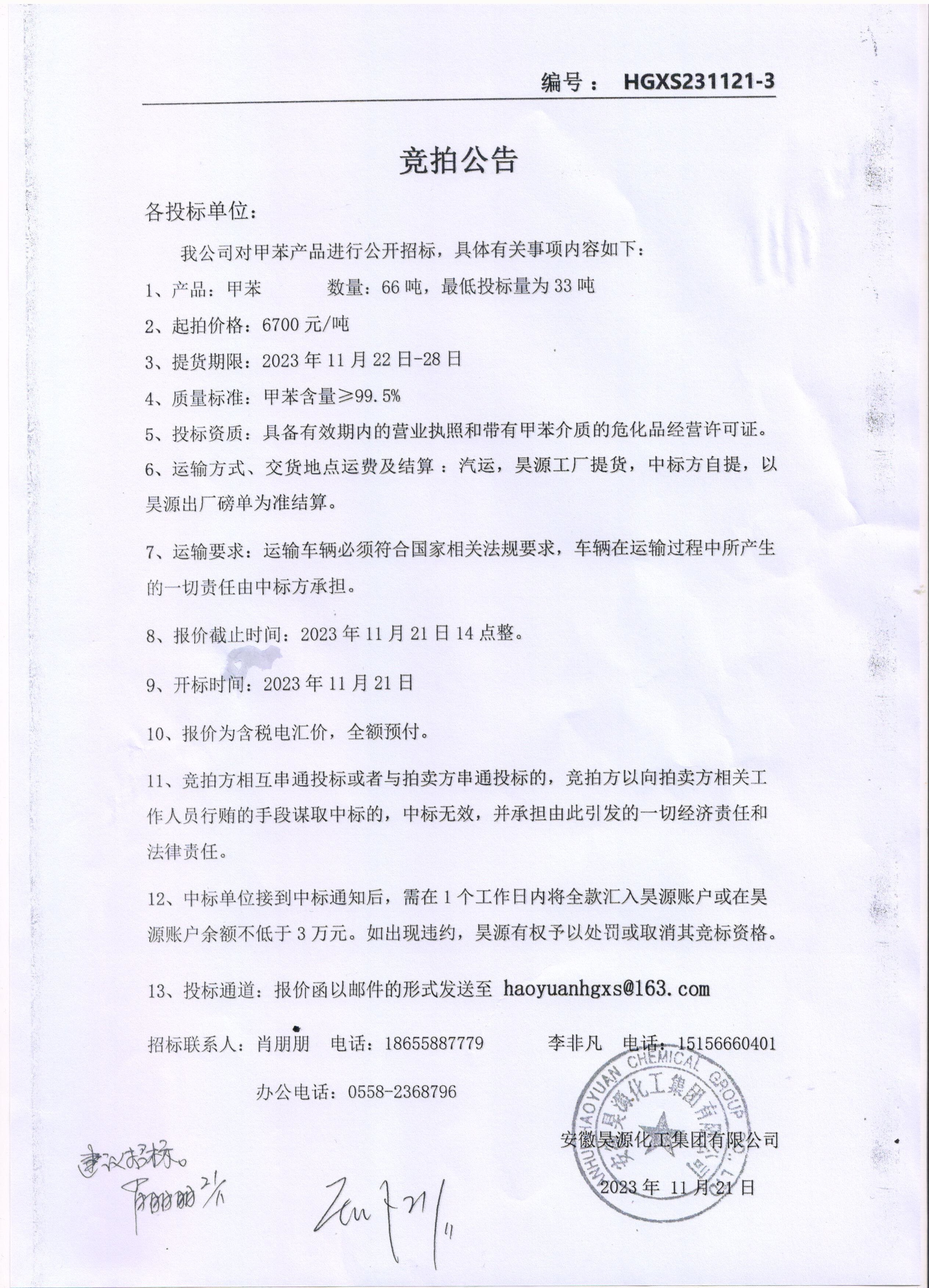 化工銷(xiāo)售公司甲苯產(chǎn)品招標(biāo)公告