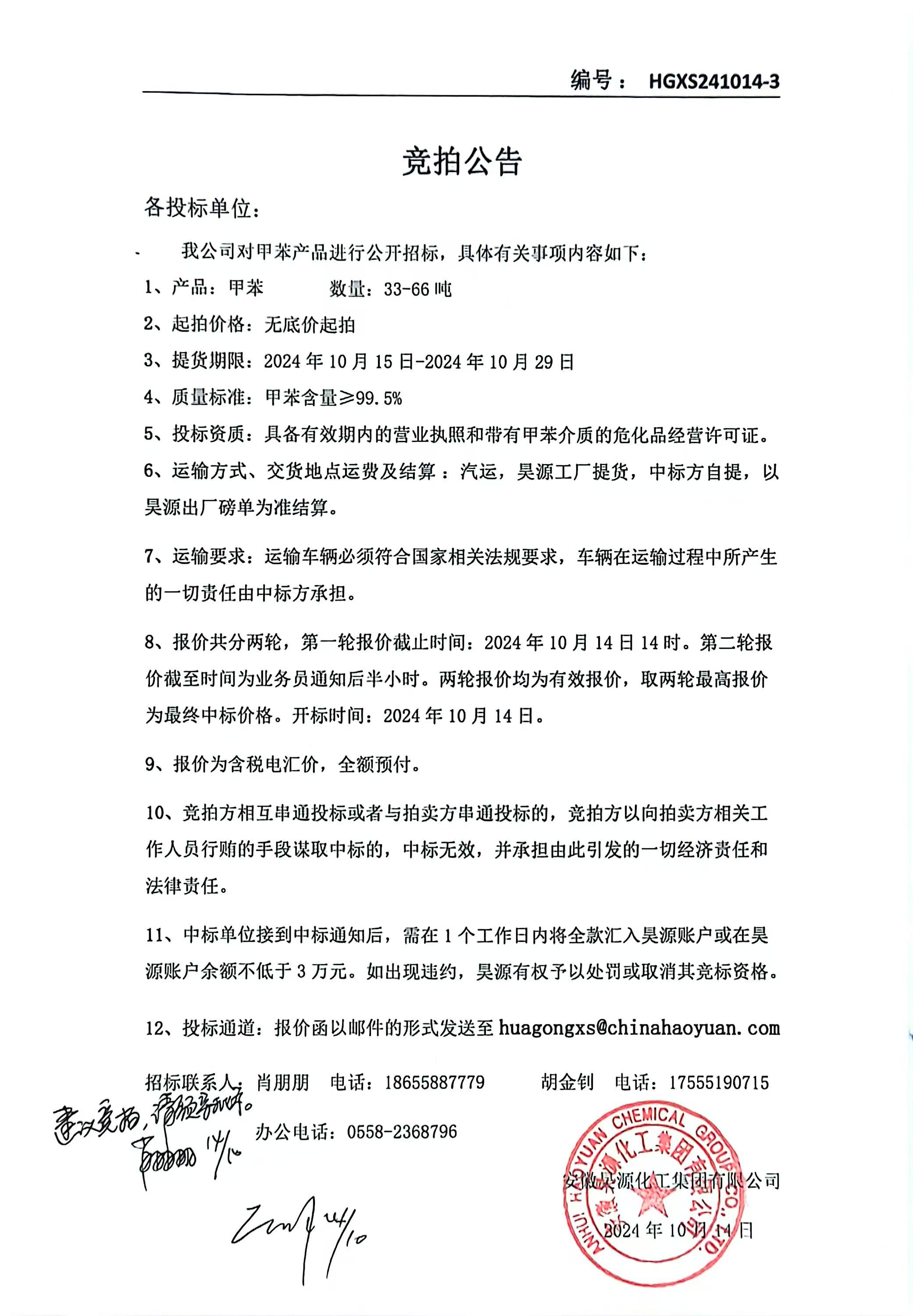 化工銷售甲苯銷售招標公告