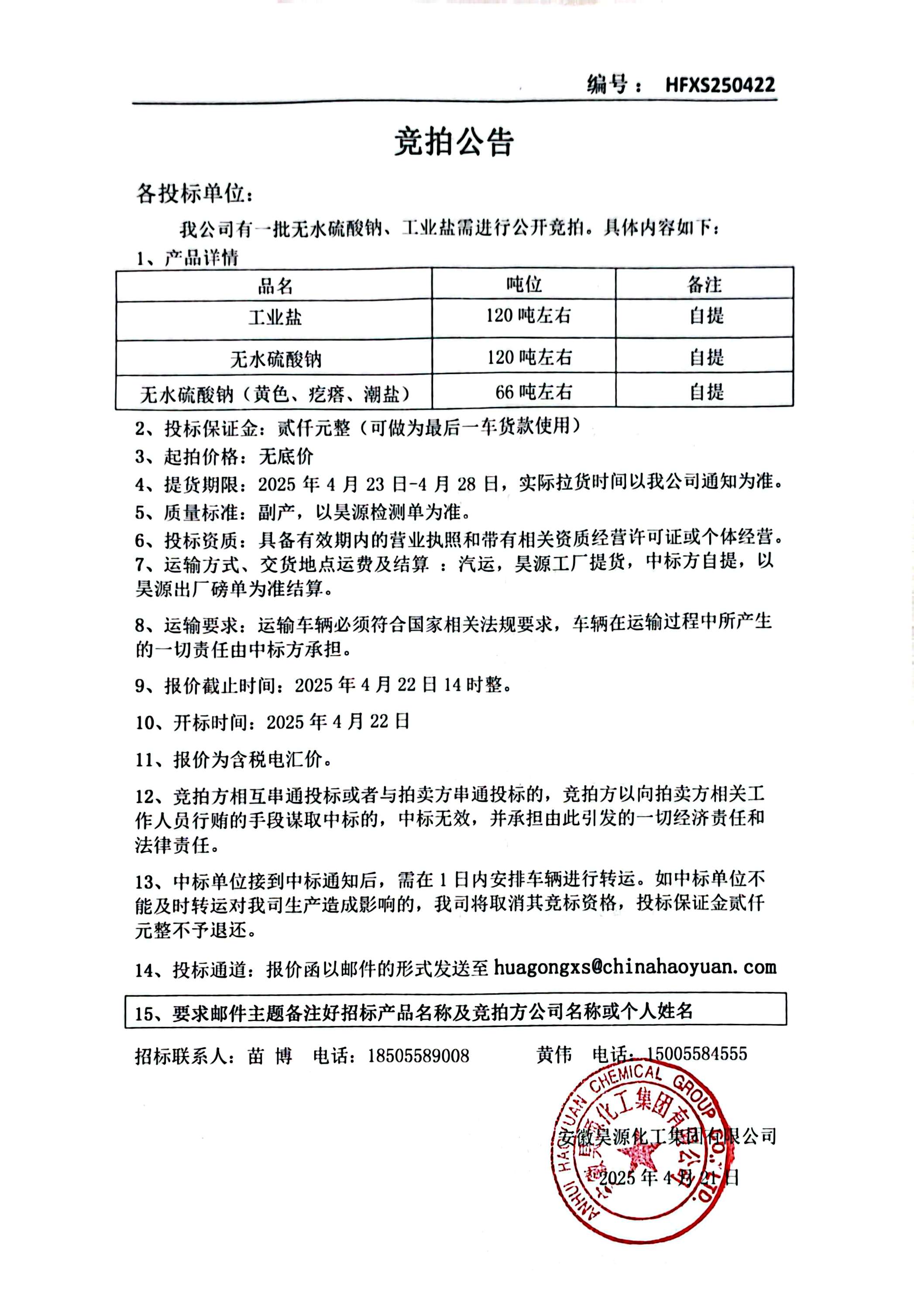 一批無(wú)水硫酸鈉、工業(yè)鹽銷(xiāo)售招標(biāo)公示